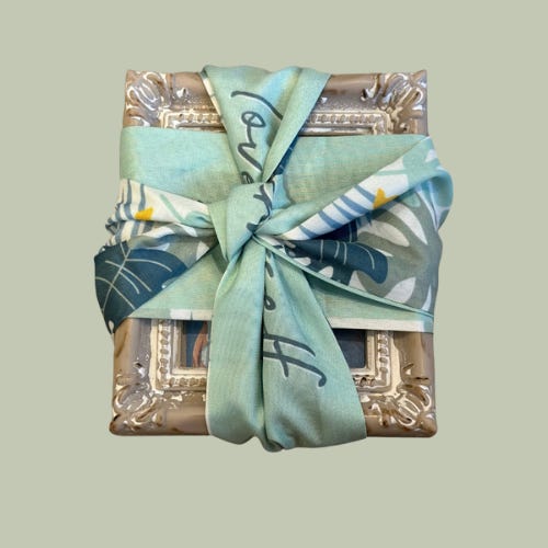 Scarves Hold Stories: Scarves are both practical and beautiful - they are meant to be reused, reinvented and remembered. That’s why I get them from thrift stores and vintage shops. Each scarf already has a story, and when it wraps your artwork, that story is folded into your own. Unwrapping becomes a kind of ritual when the packaging itself matters. With Furoshiki, each knot and fold is intentional. The moment of untying becomes an invitation to pause, to notice, to appreciate. It’s not just about getting to what’s inside—it’s about honoring the journey to it.
