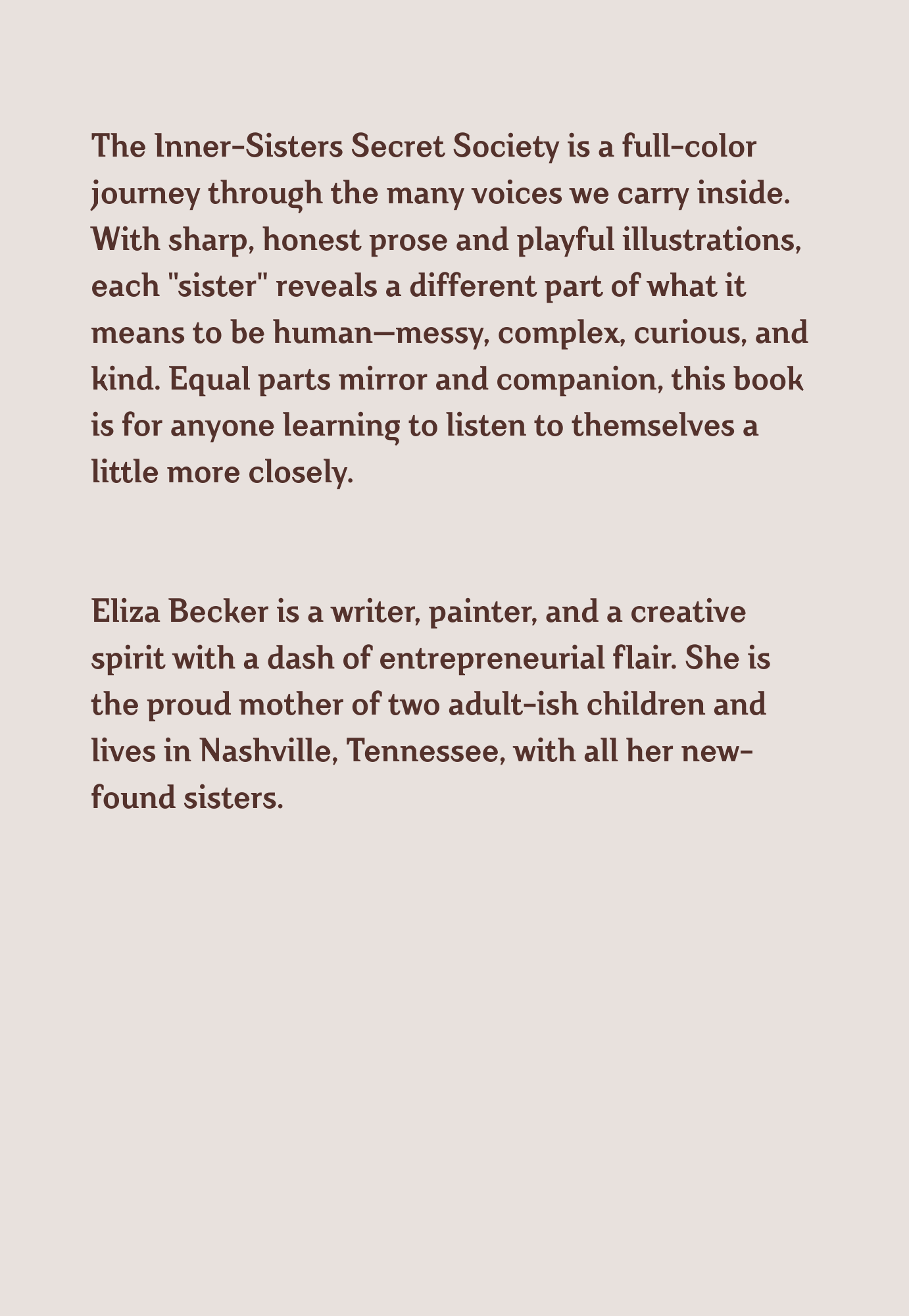 The Inner-Sisters Secret Society is a 50-page full-color journey through the many voices we carry inside. With sharp, honest prose and playful illustrations, each "sister" reveals a different part of what it means to be human—messy, complex, curious, and kind. Equal parts mirror and companion, this book is for anyone learning to listen and trust their own inner voice. Written and illustrated by Eliza Becker, aka: Lizzie Stuhlreyer.