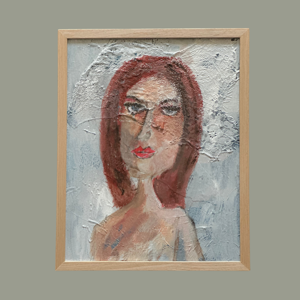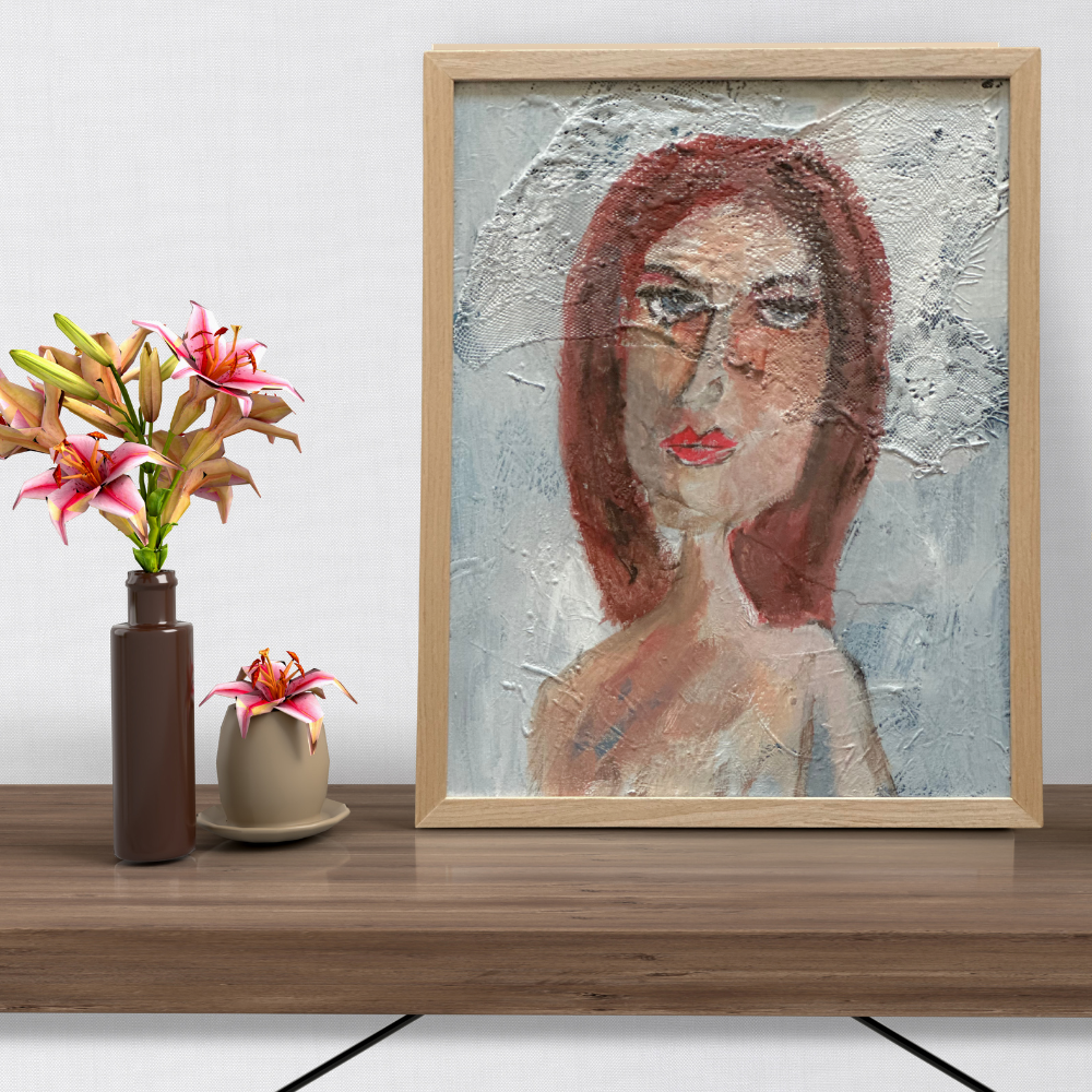 Multi-Media: Acrylic and Fabric on 11"x14" Canvas. Light wood frame.